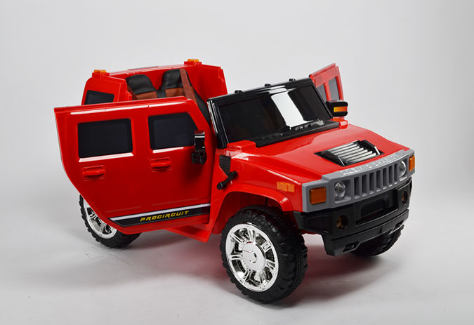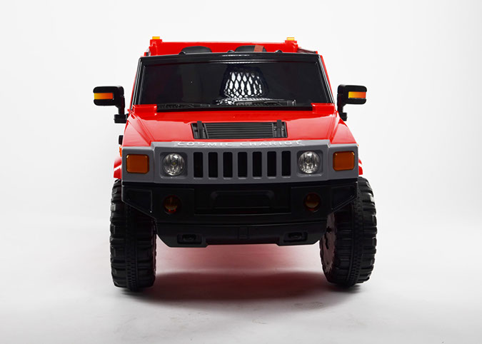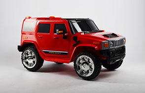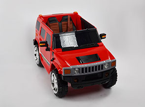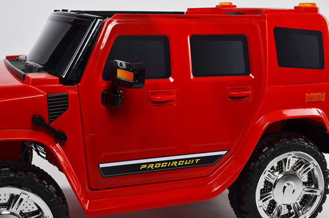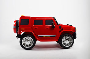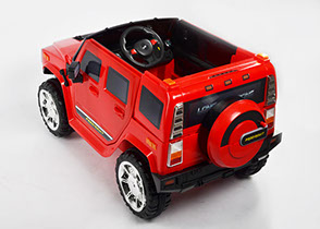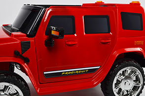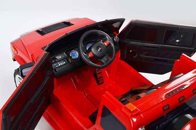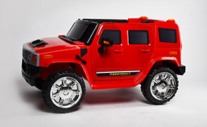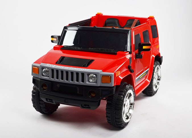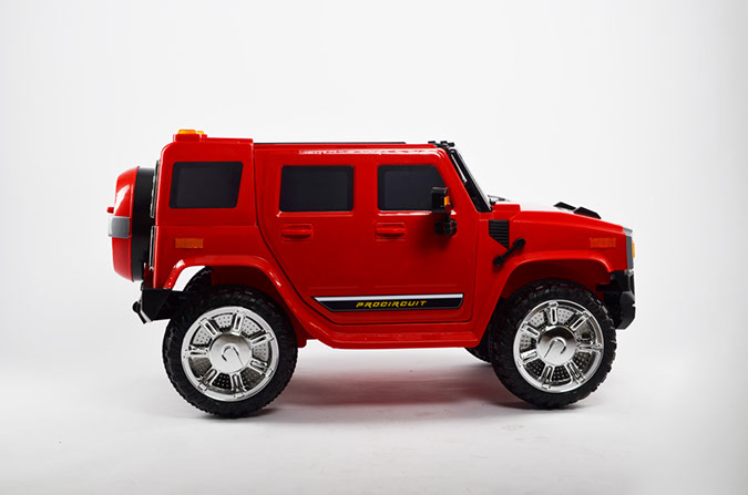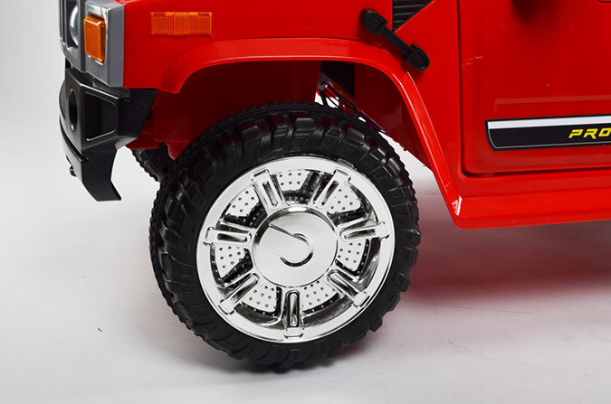 Отлично исполненная копия взрослого американского внедорожника. Это одна из самых узнаваемых детских машин. Колёса как самостоятельный модуль с возможностью включить подсветку (надо сказать, что освещение колёс работает на батарейках). Ключ-кнопка, мягкое сиденье, открывающиеся двери, пятиточечный ремень безопасности – в целом, довольно неплохая комплектация для бюджетного электромобиля.